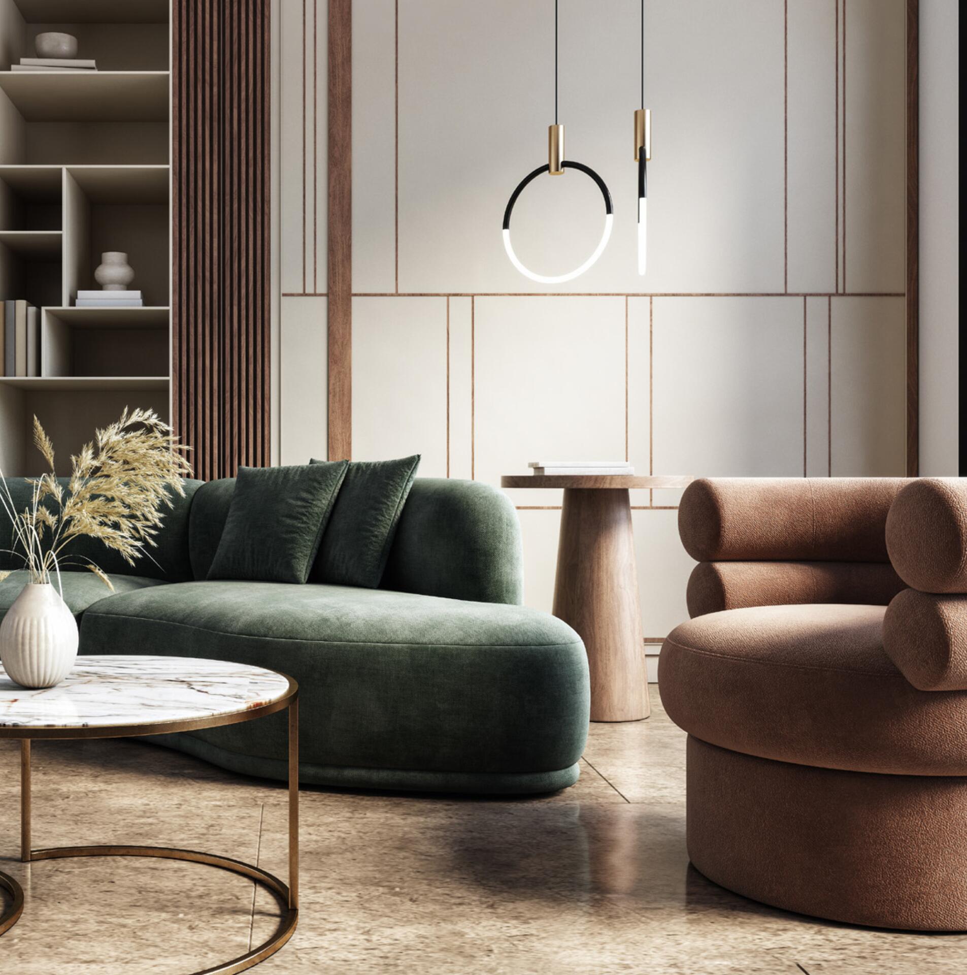 The development comprises 359 residences, featuring stylish 1-, 2-, and 3-bedroom apartments, as well as 3-bedroom townhouses. The interiors are elegantly designed in soothing natural tones of beige, green, and brown, highlighting spacious layouts, abundant natural light, and top-quality materials. A focus on texture and color creates a cozy, upscale atmosphere, complemented by expansive windows that invite in natural light and provide scenic views of the verdant surroundings.